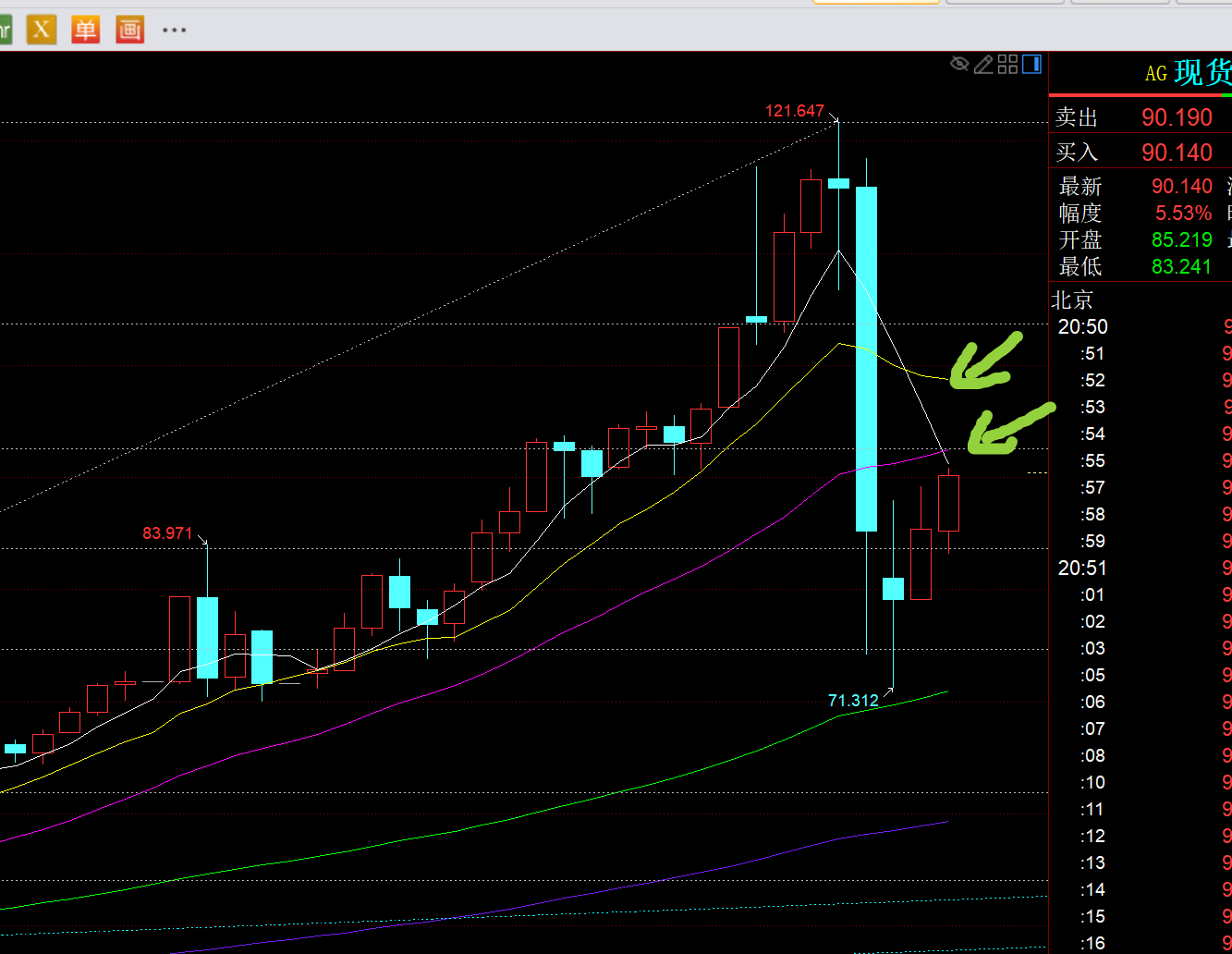 第二,白银方面:昨日早间拉升,回踩计划79上跟随看涨,也并未给机会;欧美盘强调留意86-87位置得失,价格一直围绕它波幅不大,也就不去参与;