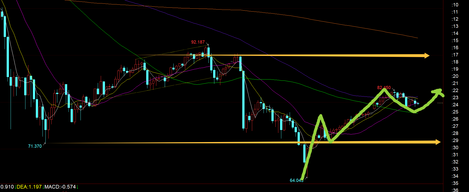 白银方面:今日开盘小幅高开后一路慢涨,触及82.5一线后有所震荡回落,整体幅度不大,从小浪形看,应该还有一波拉升走高,留意77.5支撑上企稳看北,阻力目标83、86-88、90等;
