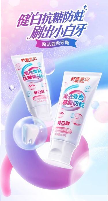 对家长而言,孩子的口腔健康始终是心头大事,而蛀牙作为儿童口腔健康的首要隐患,也成为了无数家长最为焦虑的核心痛点。儿童乳牙釉质薄、抗酸能力弱,再加上日常甜食、含糖饮料摄入频繁,刷牙不认真、清洁不到位,极易导致口腔细菌滋生、牙釉质被侵蚀,进而引发蛀牙,不仅影响孩子正常进食,还可能损害恒牙发育。舒客宝贝精准捕捉家长核心诉求,专为儿童研发魔法变色牙膏,将趣味互动与专业防蛀深度融合,让孩子主动爱上刷牙,从根源抵御蛀牙风险,全方位守护儿童口腔健康。