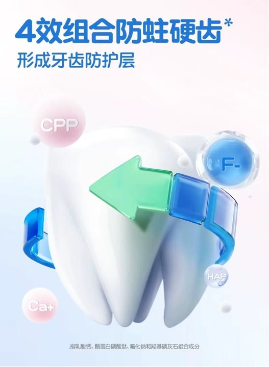 针对儿童乳牙脆弱、易受酸蚀的特点,这款牙膏的防蛀功效更是精准发力。产品可实现12小时长效抗糖酸防护,有效抵御孩子日常摄入的甜食、含糖饮料产生的酸性物质,减少牙釉质酸蚀,从源头阻断蛀牙形成;同时,添加乳酸钙、酪蛋白磷酸肽、氟化钠、羟基磷灰石四大核心护齿成分,协同作用在牙齿表面形成坚固防护膜,增强牙釉质硬度,实现防蛀固齿、强健牙釉质的双重功效,全方位抵御蛀牙威胁,守护儿童口腔健康。