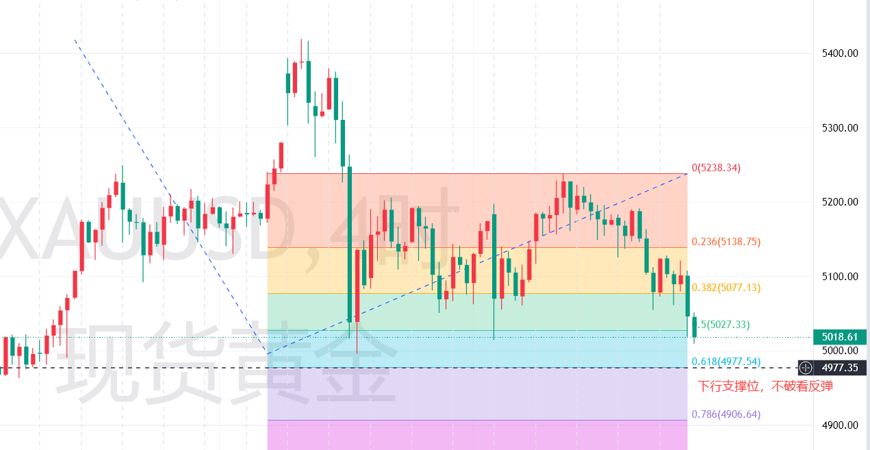 当下黄金下跌,主要源于市场情绪与政策预期波动。市场对美联储降息预期降温,资金持币观望,等待明确信号。一旦降息预期重燃,资金将回流黄金,通胀逻辑将推动金价上扬。金价跌破5000后,下行空间已然打开,早盘的探底回升构筑起企稳信号。今日,5000 - 5010区域的压力位至关重要。若金价能站稳5100上方,下跌动能将大幅削弱,行情重回箱体震荡,多空陷入拉锯;若强势突破该压力区,上行目标直指5300。反之,若价格在此区域持续承压、震荡下行,空头压力将再度升级,下方有望测试4942位置。