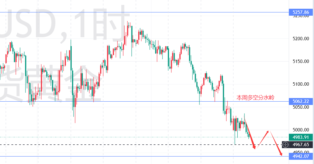金价今日延续了上周的跌势,亚盘虽有反弹,在欧盘开盘后再度下行收复了涨势,现在的操作思路还是一个逢高做空为主。从小时级盘面上来看,5062这里可作为前半周的阻力位来参考,在没有站稳此位置之前先按照3浪的下行对待,短线上关注亚盘上探5036的高点位置压制情况;下方支撑关注早间下探的4967这里,其次是4923附近。晚间的走势秦氏金升个人观点是:金价会走跌刺破日内低点4967后再反弹,然后反弹到5000关口再走跌去到4942附近;