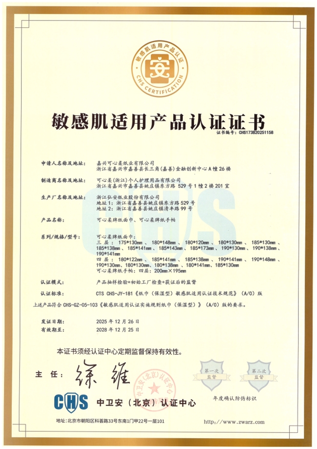 从 BBI 婴儿柔平衡标准的科学量化,到人体斑贴、皮肤刺激、变态反应等多维度的专业技术检测,再到敏感肌适用的官方认证,可心柔构建起 “标准 + 检测 + 认证” 的三重产品安全认证,让护鼻纸与保湿小绒巾拥有坚实的技术支撑,二者形成 “鼻部 + 肌肤” 的全维度防护闭环,让春季敏感防护更专业、更安心。