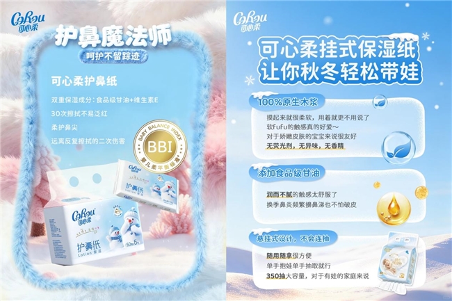 解决原料层面的痛点后,可心柔进一步深挖消费者在纸巾擦拭过程中的使用痛点,发现掉屑、泛红、纸张粗糙等核心问题。于是,可心柔通过精准调控长短纤维配比,将护鼻纸的掉粉率控制为0,远超国标基础要求,从根本上避免纸屑被宝宝吸入或刺激娇嫩肌肤;通过添加食品级甘油利用其吸湿和润滑的特性,让纸张表面形成保湿层,擦脸不带走皮肤水分、擦鼻不泛红,完美适配婴儿人群、敏感肌人群鼻腔黏膜、面部皮肤屏障极薄的生理特点,这也是科普博主们在视频中反复强调的“保湿纸核心价值”。