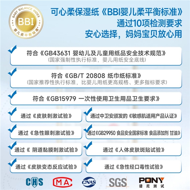 可心柔精准洞察宝妈们对品质透明、安心可控的深层期待,不止满足需求,更先于妈妈所想,多做一步—— 自主研发推出BBI 婴儿级柔软平衡标准。这不是简单的品牌自定规则,而是从母婴真实使用场景出发,对婴童保湿纸进行体系化、量化规范:从柔润亲肤、安全无添加、纯净基材、婴童标准四大维度,建立九大量化指标,如柔软度≤100mN、30次擦拭不易泛红、原料要100%原生木浆等,把“软乎乎、不粗糙、不掉屑”的模糊期待,转化为可检测、可验证的硬性标准,让柔软不再靠感觉,让每一份品质都看得见、信得过,全方位守护宝宝娇嫩肌肤。