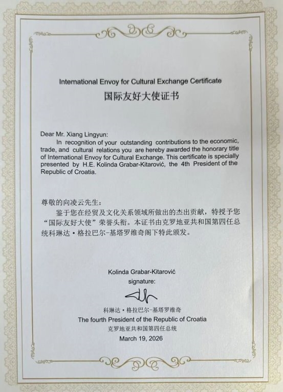 此次获得克罗地亚前总统的亲自授勋,不仅是对向凌云先生个人成就的认可,更是对其在国际经济合作与经贸领域持续努力的最高肯定。