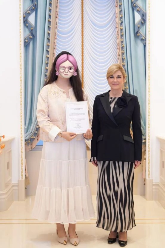 上图为向凌云先生的授权代表与克罗地亚共和国第四任总统科琳达·格拉巴尔-基塔罗维奇