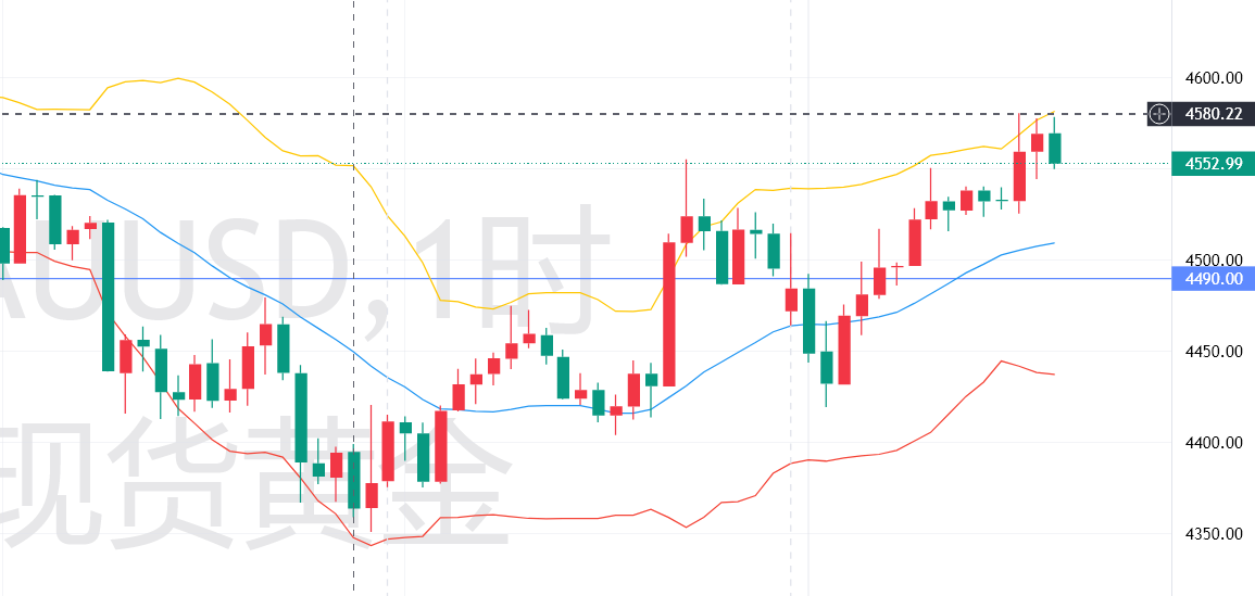 小时级别:布林带中轨位于4510附近,形成动态支撑,与日内反弹后的回踩低点高度贴合,对价格形成有效支撑;上轨位于4580-4590附近,形成短期强阻力,今日价格冲高至4580.09美元后受上轨压制出现回落,未能有效突破。MACD指标呈现正值,柱体先扩张后收敛,反映高位多头动能放缓,属于短期获利盘撤离引发的节奏调整而非趋势反转,DIF与DEA维持在零轴上方,多头格局未被打破;RSI(14)值已接近70超买阈值,动量强劲但已接近极端水平,短期需警惕回调风险,若RSI突破70进入超买区间,可能引发更大幅度的获利了结回调;KDJ指标三线高位粘合,有拐头向下迹象,进一步印证短期多头动能减弱,震荡调整概率增加,目前价格围绕4560美元区间博弈,多空分歧加剧。