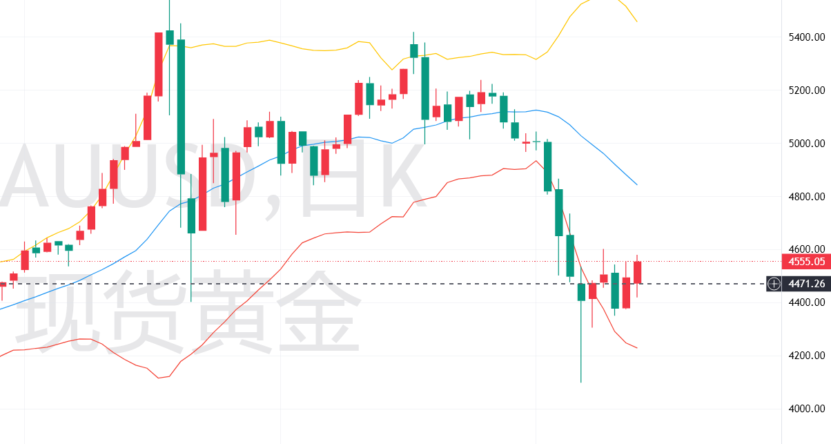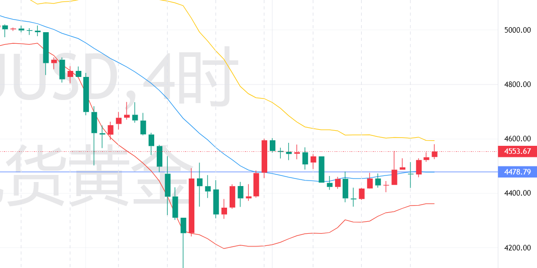 四小时级别,短期反弹动能强劲,中期空头趋势持续缓解,当前处于技术性修复加速阶段,价格沿短期均线上行,走势相对强势,但冲高后承压迹象明显。RSI指标自超卖区持续回升,目前已接近70超买阈值,显示多头动能强劲但需警惕回调风险,尚未进入极端超买区间,仍有一定上行空间;MACD绿柱完全收敛,已形成金叉,红柱持续扩张,显示空头动能彻底衰减,技术性修复需求得到释放,多头动能逐步占据主导;短期5日、10日、20日均线形成多头排列,明确短期多头趋势,打破此前相互缠绕的僵持态势,均线系统对价格形成有效支撑;布林带向上开口,价格运行在布林带中上轨之间,多头趋势明显,上轨压制作用逐步显现,今日冲高至4580.09美元后受上轨压制出现回调,抛压逐步增加。