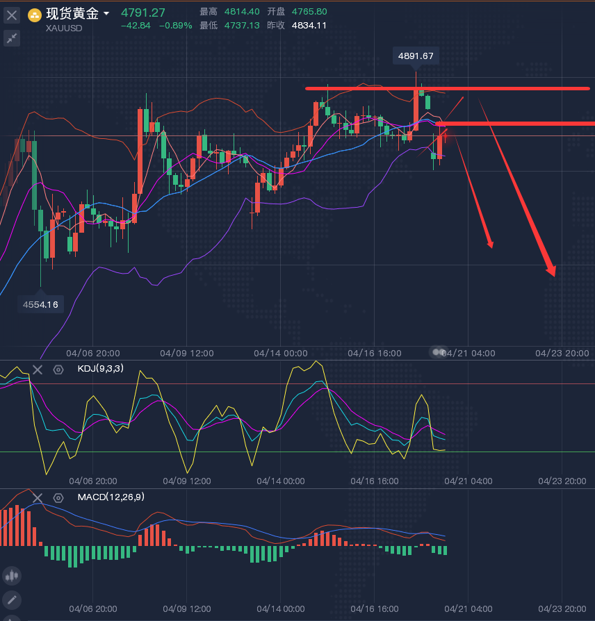 四小时方面,黄金呈现震荡上行走势,但是每次冲高之后都伴随着回落,而 上方4860-4900区域压力明显,这个位置很可能成为黄金短期的一个转折点, 再加上短期均线已经形成死叉下跌模式,死叉的位置不破 不看好反弹,也就是说今日可在4810下方继续看空!