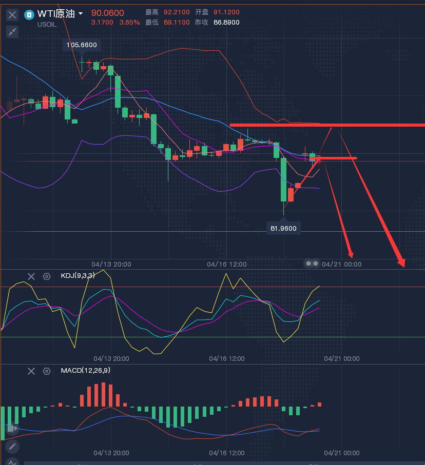 四小时方面,原油也是一个震荡下跌的走势,那么日内关注两个位置,一是中轨91附近直接看下跌,二是等反弹触及上轨95附近后看下跌!