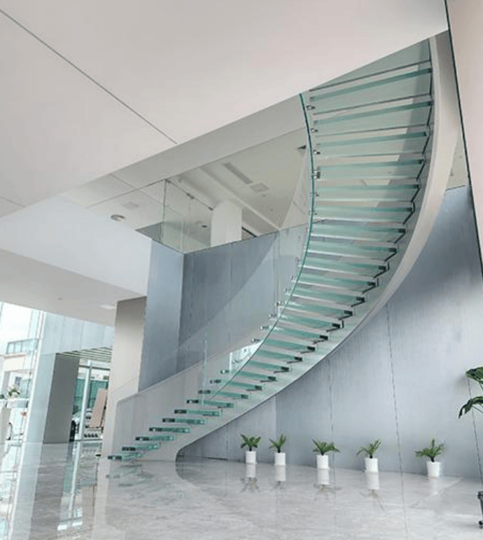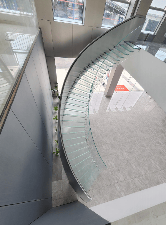 掌握国内独家弧形全玻璃楼梯制作安装工艺,可实现小弯半径、无折痕、高通透的玻璃曲面;