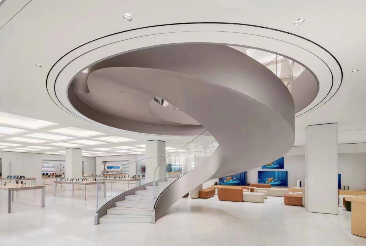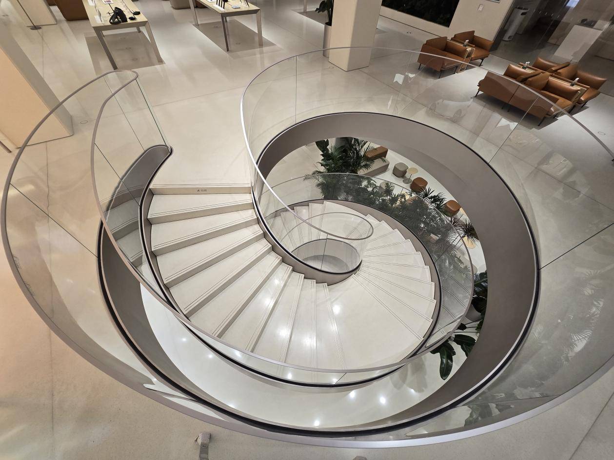 华为天津旗舰店:钢构与玻璃组合悬挑楼梯,在玻璃栏杆转角处采用了小半径热弯玻璃,同时,玻璃槽与地面高度平行的特别设计,极大限度保证了楼梯的美观,成为门店的视觉核心。