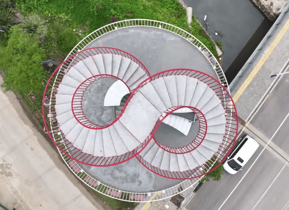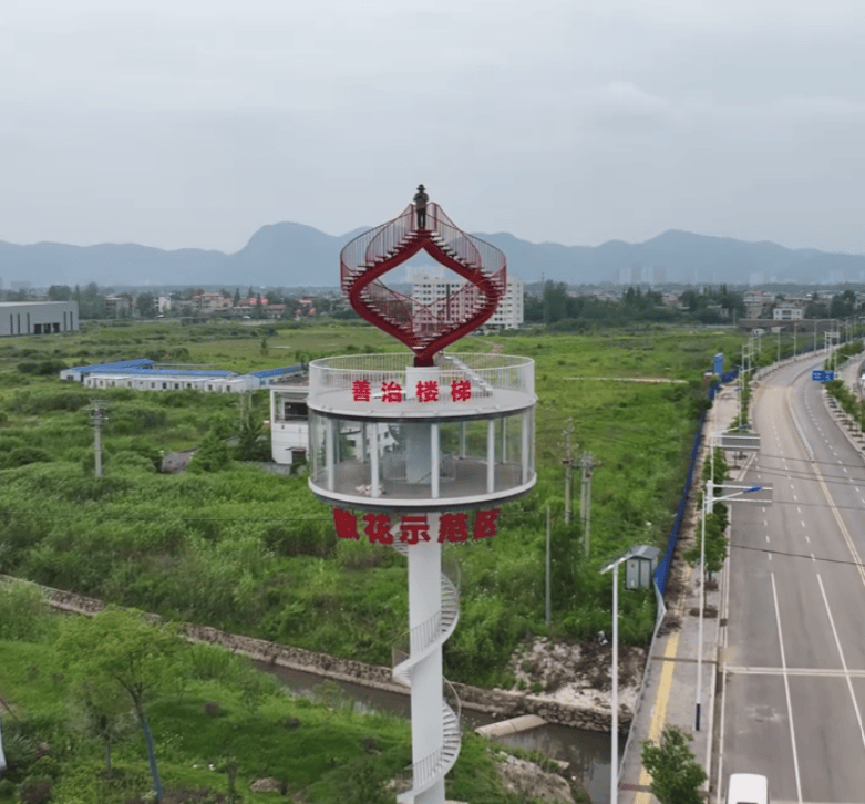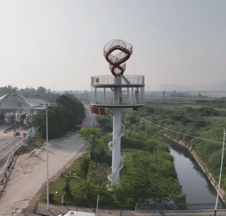 在善治的湖北工厂,就有着这样一座“不止是楼梯”的地标建筑。散花摩比斯雕塑——一座地上26米高,地下预埋二十余米的庞然大物。镂空踏步楼梯沿白色中柱盘旋而上,经过透明隔间,抵达顶层,在白色镂空栏杆的保护下,沿着摩比斯造型的红色栏杆行走,可以远远望见善治楼梯的钢结构厂房。即使是在台风天气,这座摩比斯雕塑仍然屹立不倒。这是
