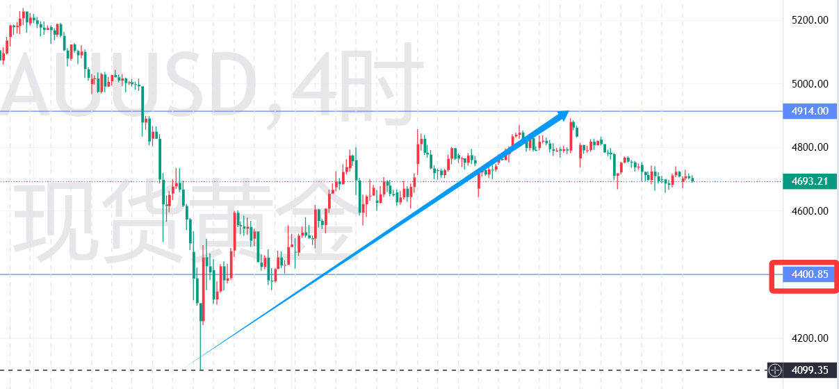 四小时级别上,金价最后一波反弹为3月底大挫至4099后经过一个月的时间的反弹在4914附近受阻,前面老秦讲过这个位置是下跌行情里的阻力位,仍需后市走势去验证此阻力的有效性。现在主要是关注下行的延续性,最后一波上行是呈阶梯性抬升,后市操作需去看抬升途中低点位置破位情况,其中尤为关键的是4554与4404这两个位置,若有效破位4404这里,那么下方空间打开,4099这里也不算低点了。