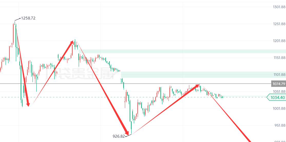 国内黄金产品同理,在1258这里走跌以来,现在算的上是第三波下行,故后市需要关注982附近的支撑情况,若失守的话,3月23的低点也会跌破,届时我会再去根据走势去判断支撑点后出新分析。鉴于交易机制的特殊性,想进场的可于982附近先轻仓参与,等待后市分析支撑再去进场,或等待金价企稳反弹后再择机进场也行。