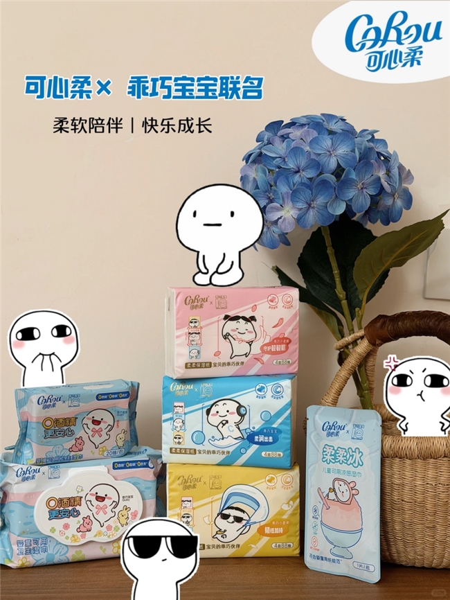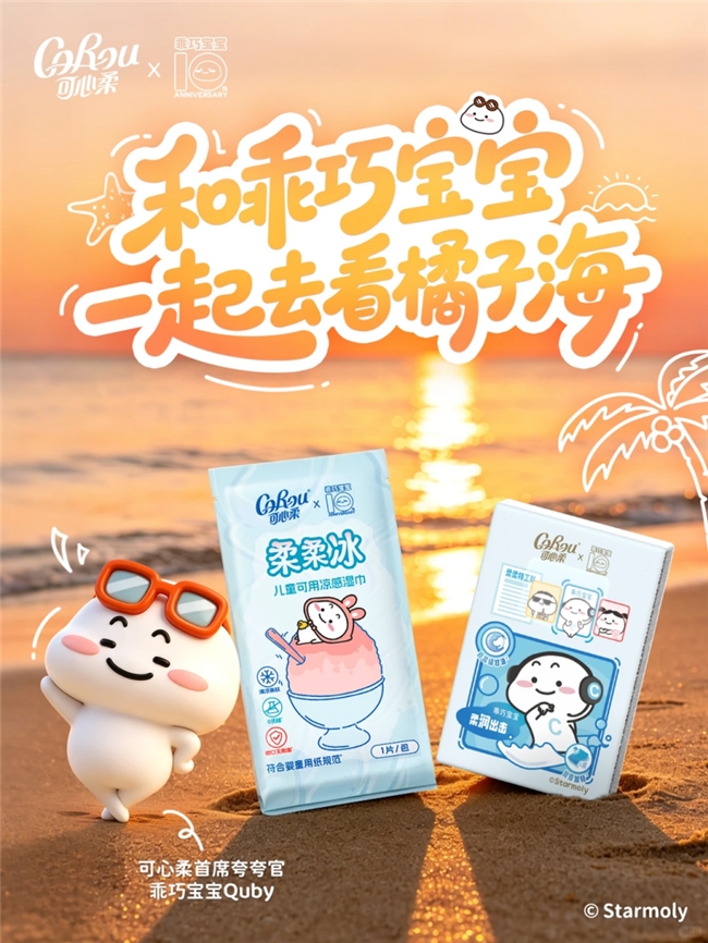 作为保湿纸领域领导品牌,可心柔立足千万家庭真实生活场景,以深度用户洞察驱动产品创新,联合国民治愈系 IP「乖巧宝宝」推出柔柔保湿纸、凉感湿巾、卫生湿巾三大联名新品,将婴童级安全标准、全场景功能设计与情感化视觉表达深度融合,打造一站式亲子出游清洁体系,为每一段亲子旅途注入安心与治愈。