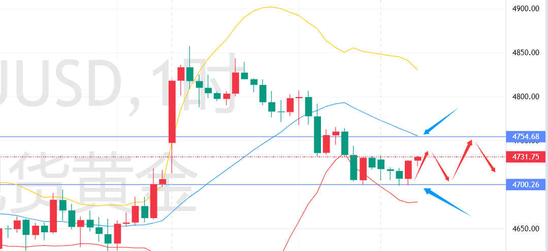 小时级别:从短期走势结构来看,昨日金价经历冲高回落的大幅波动后,今日进入震荡修复阶段,回调低点始终维持在4697美元上方,未跌破4690关键支撑位,形成了弱反弹、强支撑的短期格局,多空双方暂时处于僵持状态。从K线排列来看,小时线多以小阴小阳为主,实体部分较短,上下影线相对较长,表明市场交投谨慎,短期内难以形成明确的单边走势,整体以震荡消化前期波动为主。RSI指标方面,目前始终维持在40-50的中性偏弱区间,既未进入超买区,也未进入超卖区,表明短期多空力量相对均衡,没有出现明显的单边趋势信号;MACD指标方面,绿柱持续缩量,柱状体高度逐步缩减,DIFF线与DEA线在零轴下方逐步走平,空头动能逐步减弱,小时线级别有小幅反弹的预期,但由于缺乏成交量配合,反弹力度有限,难以突破4750关键阻力位。此外,小时线级别均线系统呈现粘合状态,5日、10日、20日均线相互交织,进一步表明短期市场震荡整理的态势,暂无明确的趋势方向。
